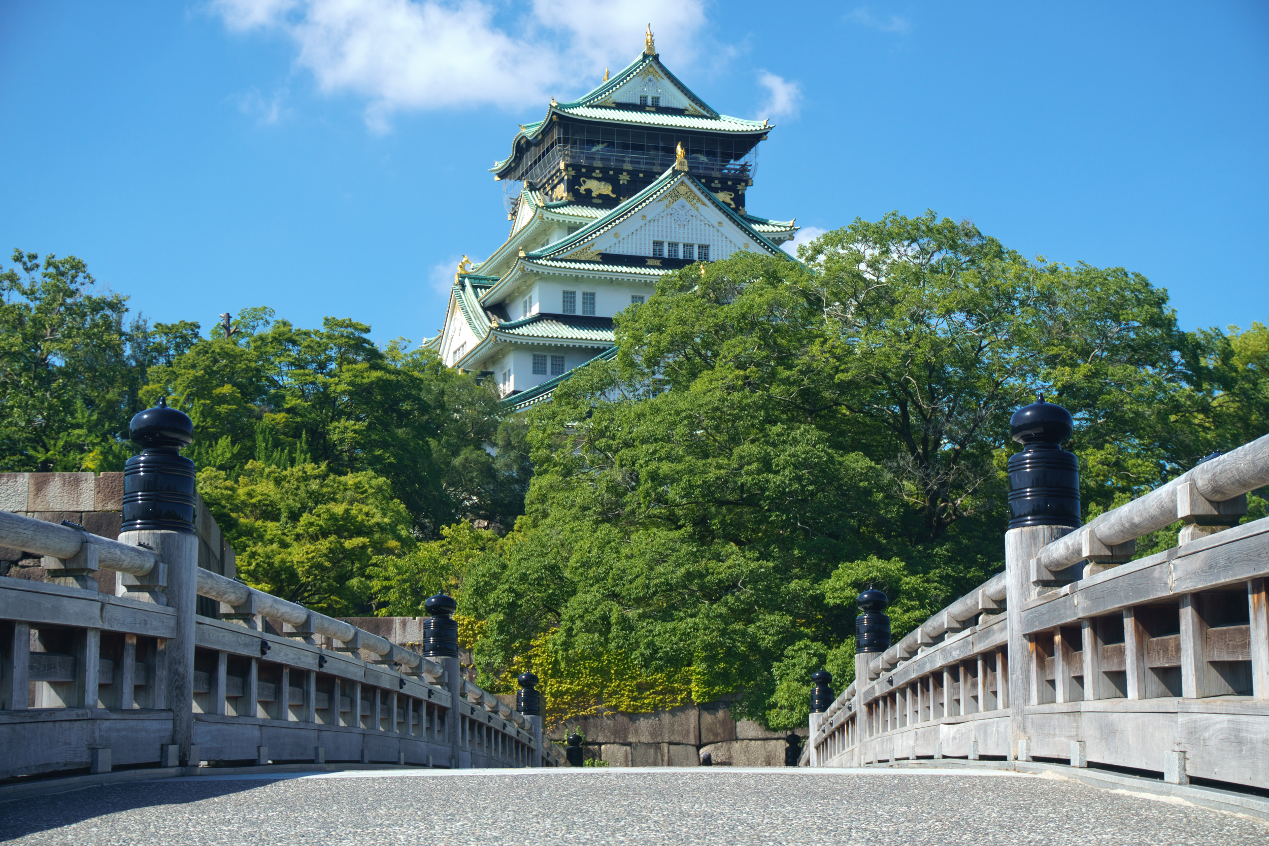 大阪城在盛夏蓝天下显得格外壮丽,古老的石桥通向这座历史的丰碑,仿佛在诉说着一个又一个关于武士与荣耀的故事