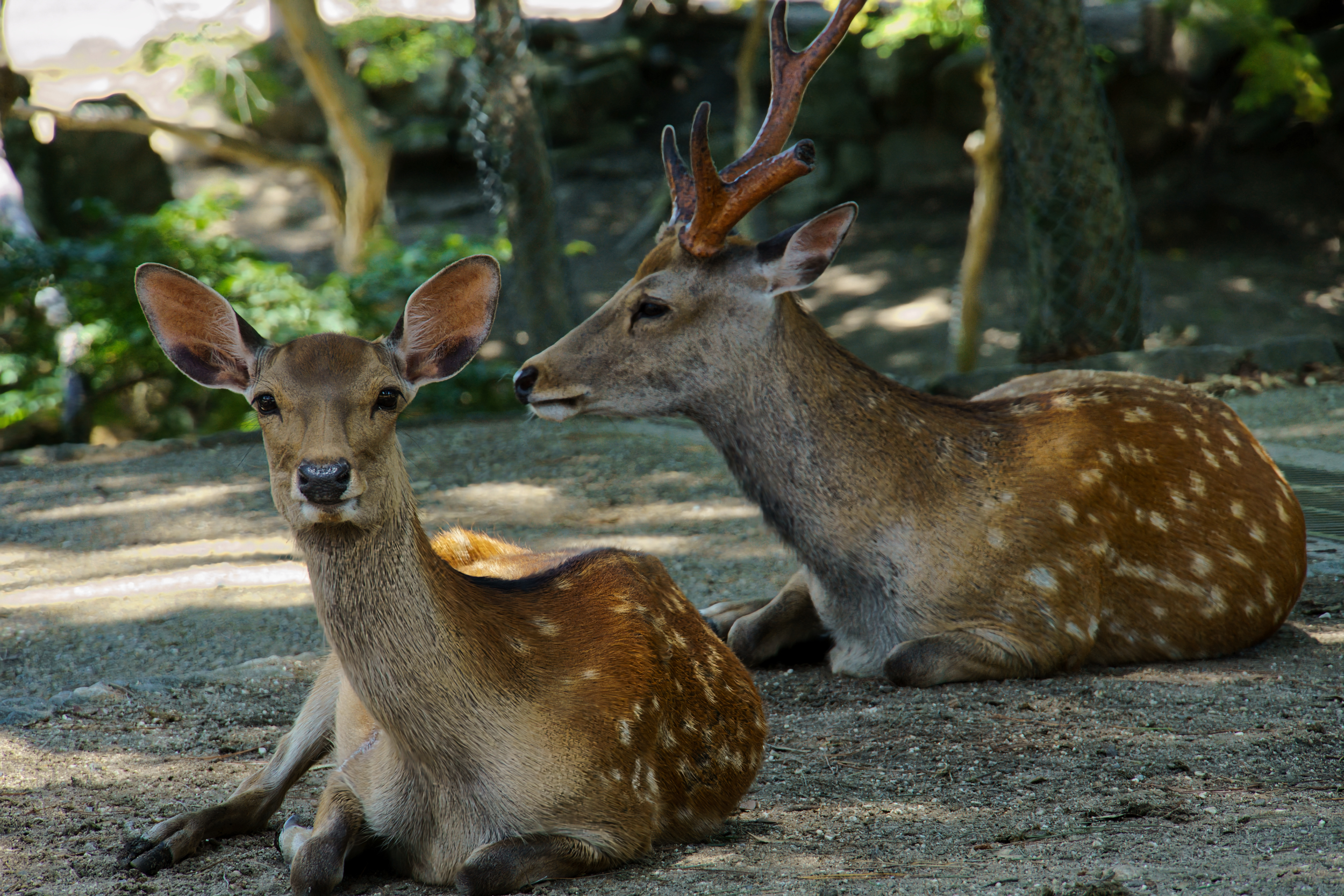 奈良公园里两只可爱的小鹿慵懒地休憩着,一只好奇地望向镜头,眼神中透露着几分温柔与灵气,让人心生怜爱