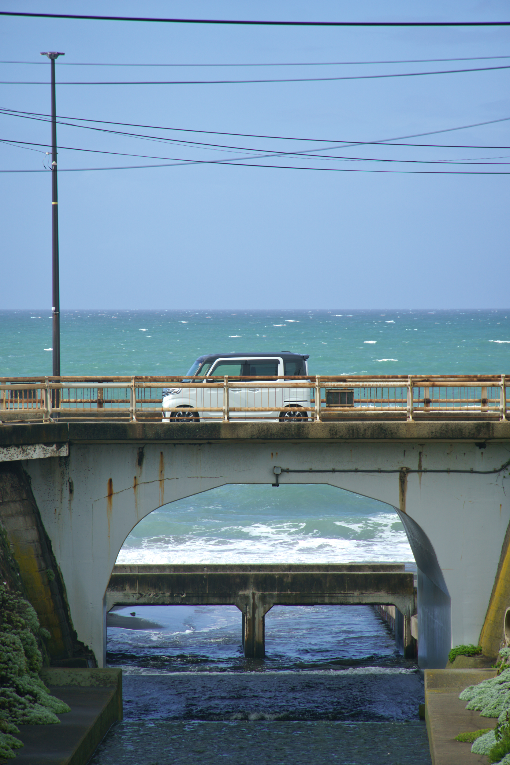 海边公路上一辆白色的车与碧蓝的大海形成一道风景线,远处的波涛翻涌,充满日式电影的宁静感
