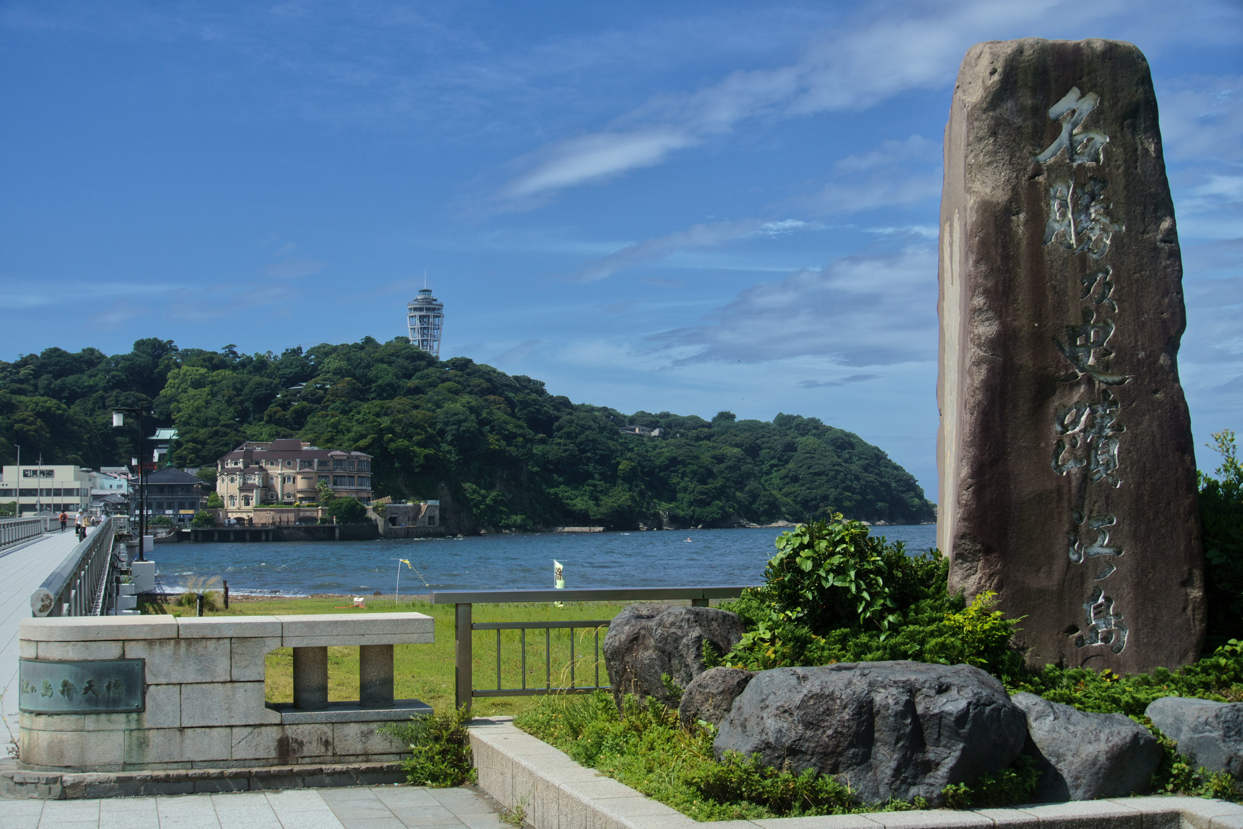 在江之岛前,一座巨大的石碑静默矗立,面前是波光粼粼的海面,远方的小岛上灯塔若隐若现,一派宁静的夏日海滨风光