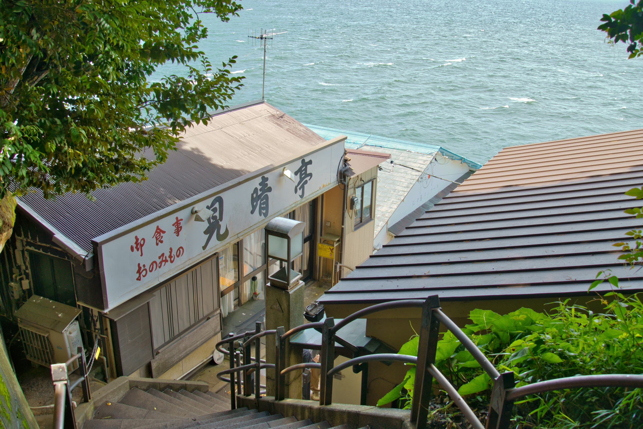 沿着石阶而下,海边的小屋散发着独特的日式风情,招牌上写着“見晴亭”,仿佛在诉说着一个关于海边生活的故事