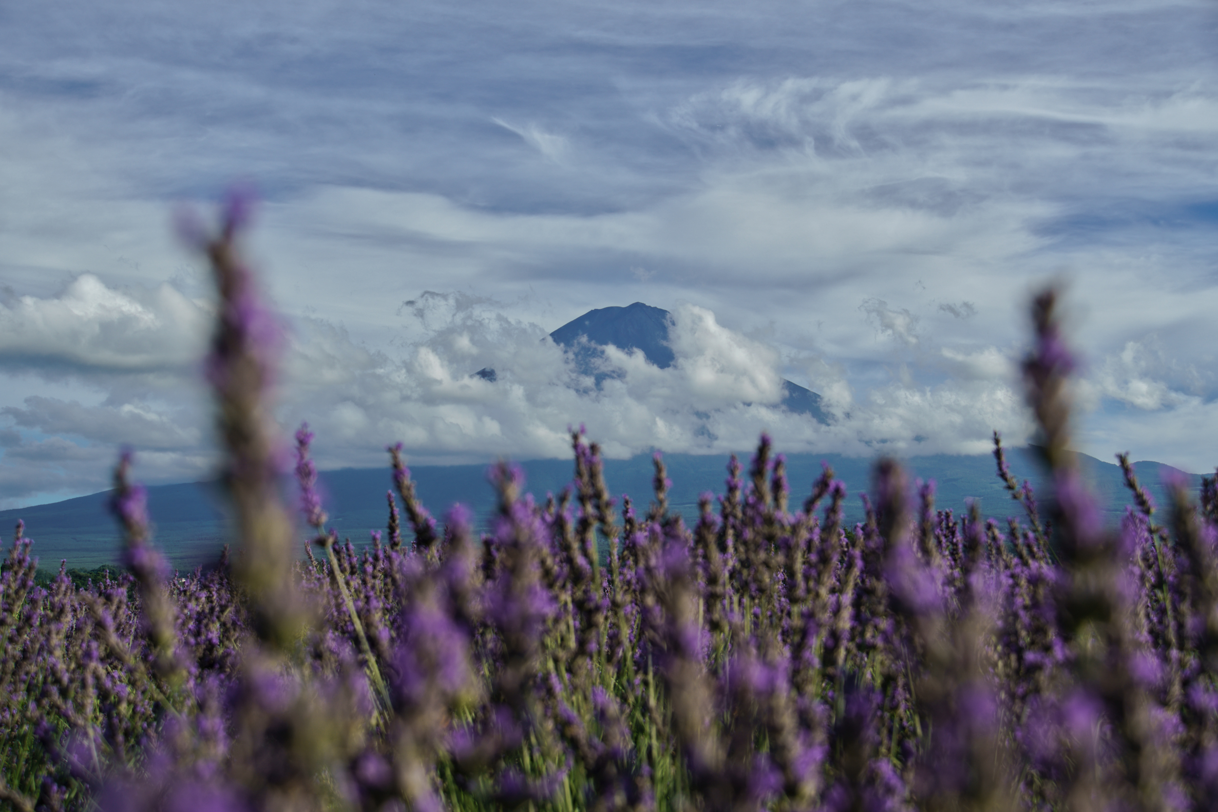 紫色的薰衣草在眼前形成一片浪漫的花海,而远处,壮丽的富士山在云雾中若隐若现,与天空中的流云共同构成一幅令人心醉的自然画卷。这种天然的色彩搭配与宏伟背景,让人心旷神怡